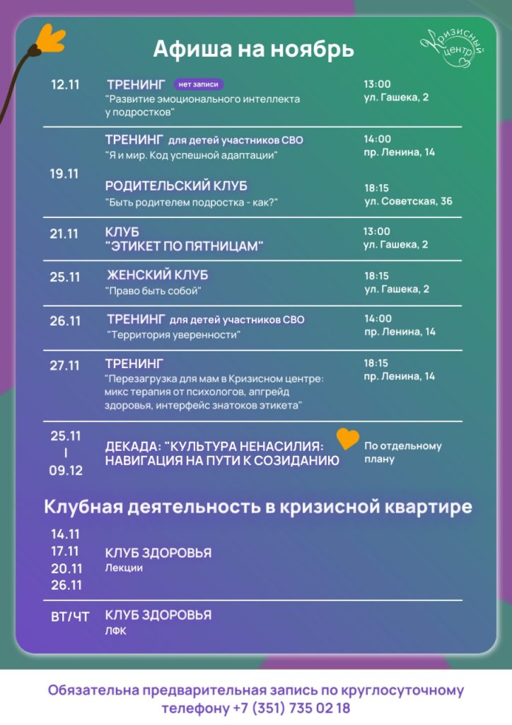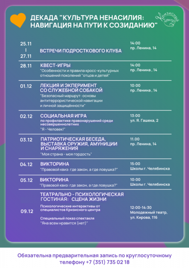 В 2025 году с 25.11 по 09.12 учреждением планируется проведение тематической декады «Культура ненасилия: навигация на пути к созиданию». В рамках декады будут проведены встречи подросткового клуба, квест-игры, лекции, социальные игры, патриотические беседы для несовершеннолетних.