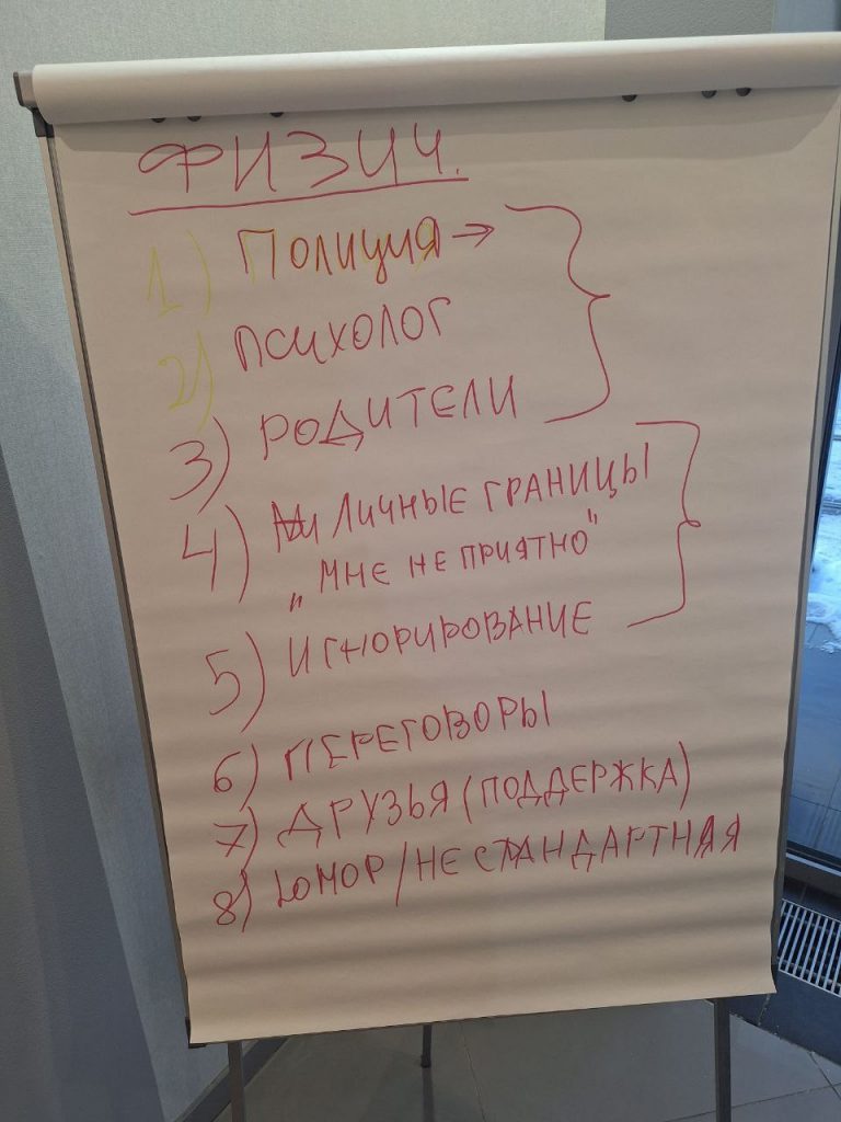 После этой практики перешли к мозговому штурму, где вместе выработали стратегии действий для жертв, наблюдателей, а также обсудили, какие меры можно предпринять в школе для предотвращения буллинга. В завершении мы обсудили, что нового узнали и как эти знания можно применить. Ребята выделили важность своевременного обращения за помощью и совместного противостояния травле!