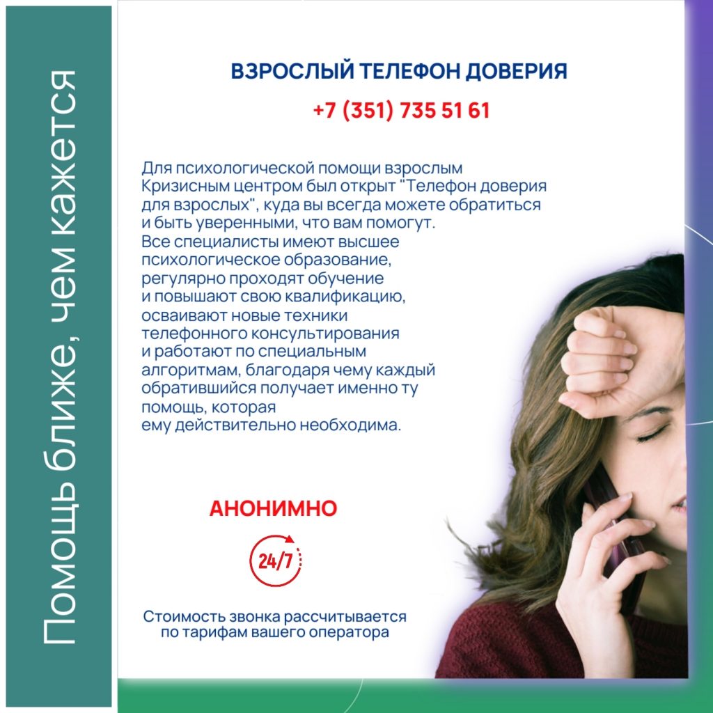 - Телефон доверия для взрослых: +7(351)735-51-61. Если вы взрослый и чувствуете, что не справляетесь с жизненными вызовами, наши специалисты готовы вас выслушать и поддержать.