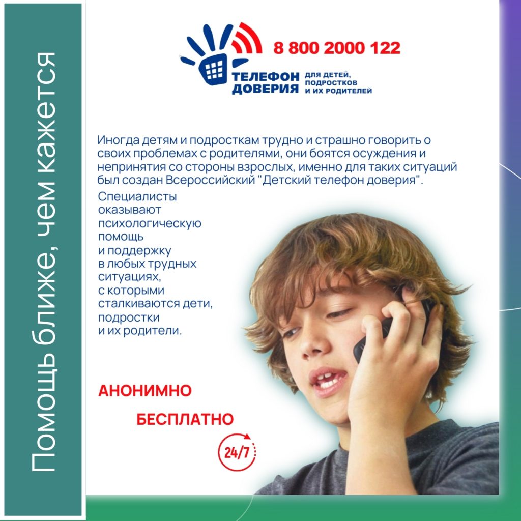 - Детский телефон доверия: 88002000122 (бесплатный звонок) или 124 (с мобильного). Этот номер – спасательный круг для детей и подростков, столкнувшихся с семейными проблемами, конфликтами со сверстниками, чувством одиночества, страхами или трудностями в учебе.