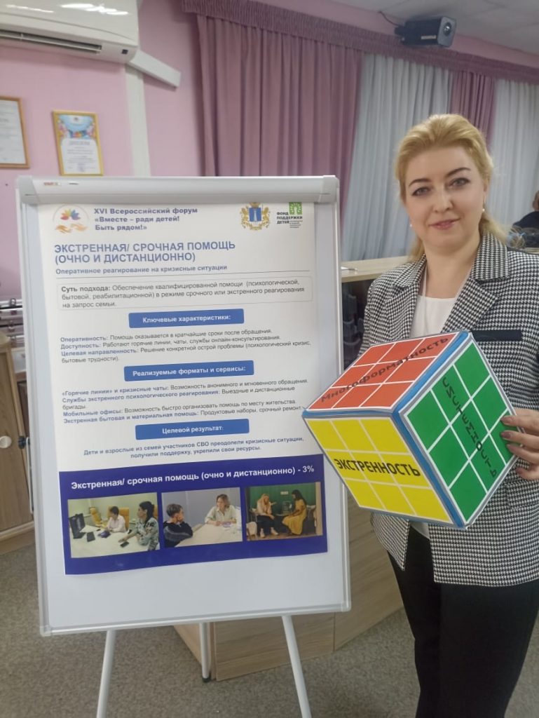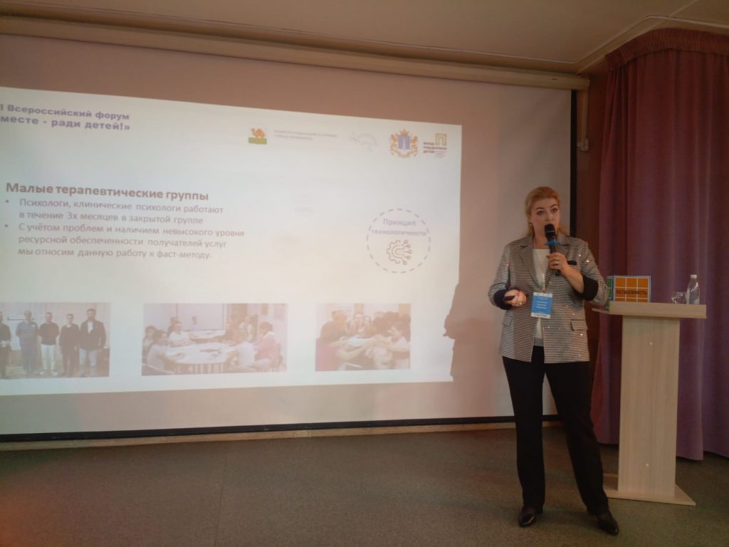23 сентября на профессиональной площадке «Эффективные инструменты помощи детям и семьям участников СВО» директор Кризисного центра Евгения Антипова поделилась с коллегами опытом оказания экстренной помощи, а также опытом реализации социально-реабилитационного заезда и психотерапевтического спектакля.