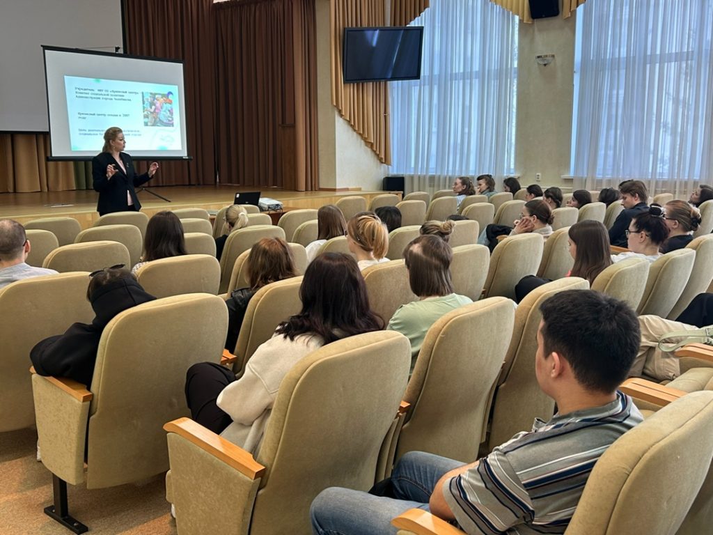 Директор Кризисного центра Евгения Игоревна Антипова рассказала студентам и преподавательскому составу о структуре центра, направлениях деятельности, озвучила основные запросы, с которыми обращаются жители города.