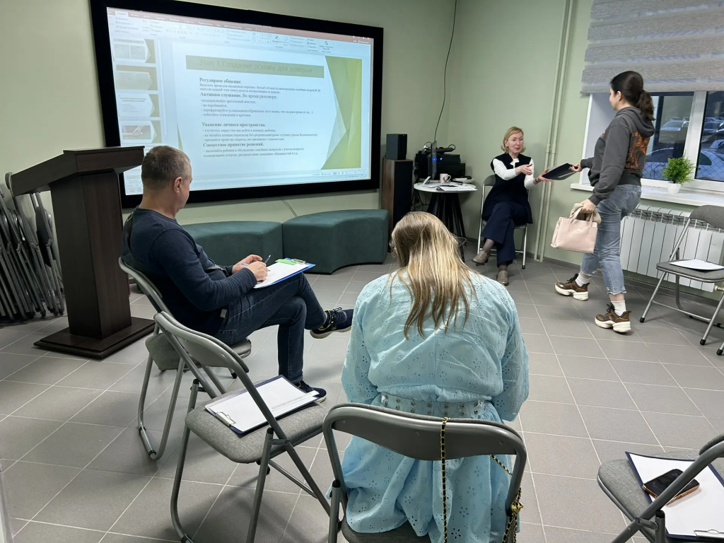 Психолог нашего центра поделилась с родителями и помогла практически освоить через упражнения, ролевые игры и групповые дискуссии навыки открытого общения, технику активного слушания и помогла выработать стратегии совместного решения проблем.