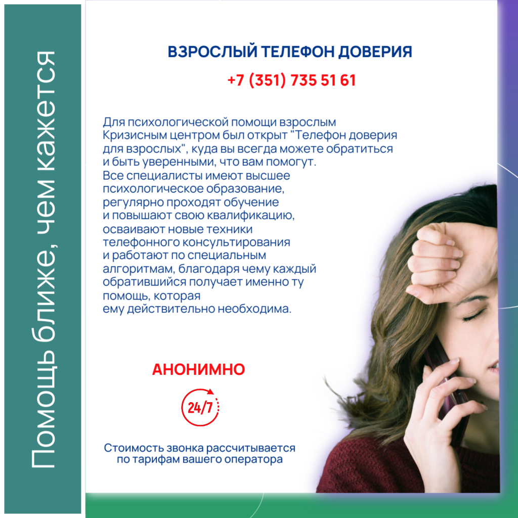 Для психологической помощи взрослым Кризисным центром был открыт «Телефон доверия для взрослых», куда вы всегда можете обратиться и быть уверенными, что вам помогут.