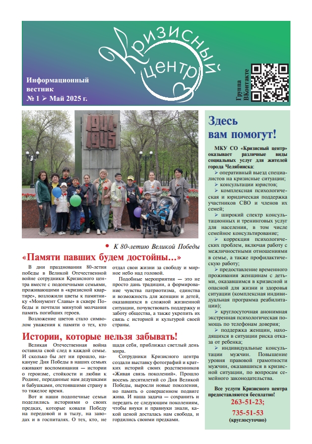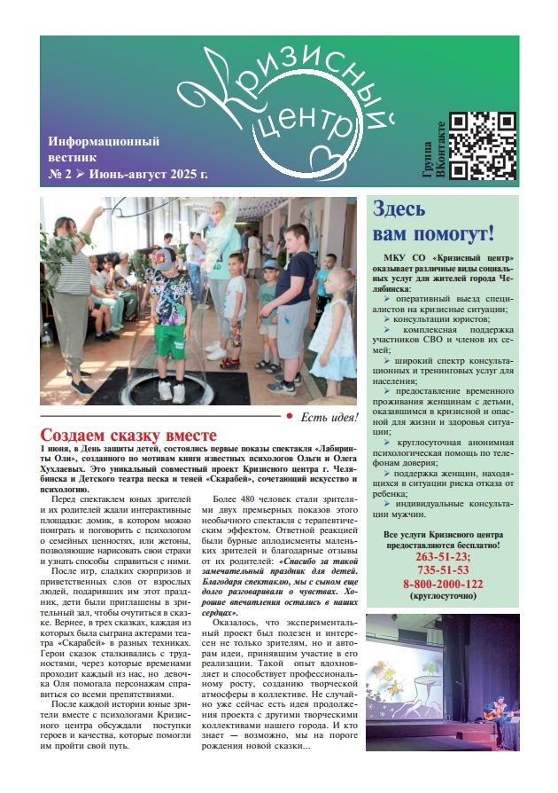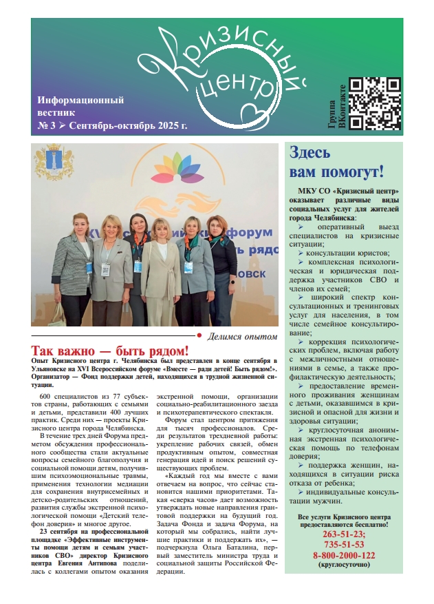 «Мы активны в онлайн-пространстве: публикуем новостной материал и психологически просвещаем жителей города через наш сайт, группу ВКонтакте и канал в Маx. — делится директор Кризисного центра Евгения Антипова. — Наряду с этим у жителей города появился запрос на печатный формат информирования: часто человеку важно взять в руки буклет, визитку, чтобы прочитать информацию в спокойной обстановке через какое-то время, поделиться ей с окружающими. Так возникла идея вестника, который содержит в себе как и основную контактную информацию, новости, так и интересную информацию по актуальным психологическим, юридическим темам».